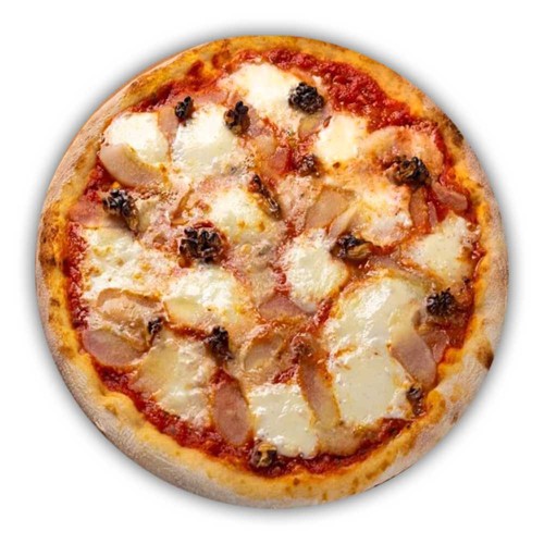ciasto, sos pomidorowy, mozzarella Fior di Latte, gruszka, ser gorgonzola, orzechy włoskie
